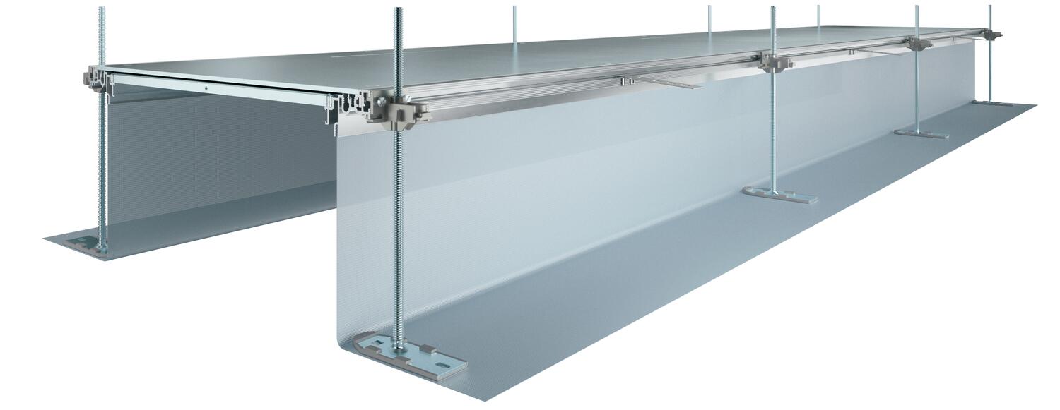 Ready-to-mount screed-flush trunking unit for cable routing, consisting of three system covers, two side profiles with attached flexible side wall made of metallic mesh, floor covering contact profiles with H = 3 mm. For dry interior rooms with dry-care floors. Also suitable for wet-care floors with appropriate system accessories. The scope of delivery contains six height-adjustable fastening brackets, six screed ties and three lid butt seals for nominal trunking widths 200, 300 and 400 or six lid butt supports for trunking widths 500 and 600. The essential levelling units (please observe adjustment height) for the lid butt supports 400, 500 and 600 are not contained in the scope of supply, please order separately. On delivery, the trunking lids are screwed on.
