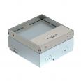 Square floor socket for use in dry-care systems and screed floors in indoor areas. Installation housing with pre-marked insertion openings for pipes (M20/M25). Cover adjustable to top edge of floor covering using four height-adjustment supports. The minimum installation depth is 75 mm, the height-adjustment range + 30 mm. Frame and cover made of stainless steel and visible in the floor covering. Cover with floor covering recess. Empty housing for one Modul 45® installation device and one data socket. When delivered, the item is closed with a blanking plate.