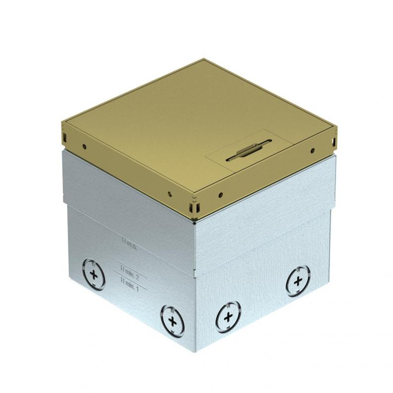 Square floor socket for use in dry-care cavity and screed floors. Installation housing with pre-marked insertion openings for pipes (M20/M25). Cover adjustable to top edge of floor covering using four height-adjustment supports. The minimum installation depth is 100 mm, the height-adjustment range 35 mm.Frame and cover made of brass and visible in the floor covering. Empty housing for up to 2 Modul 45® devices in the mounting support and 2 data sockets in the optional data technology support.