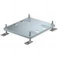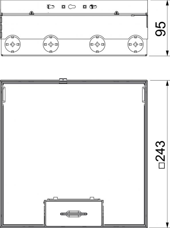 Square floor box for use in dry-cleaned cavity and screed floors in indoor areas. Installation housing with pre-marked insertion openings for pipes (M25). Empty housing for up to three UT4 universal supports for up to 12 Modul 45 ® devices. Cover adjustable to top edge of floor covering using four height-adjustment supports. The minimum installation depth is 95 mm, the height-adjustment range + 30 mm.