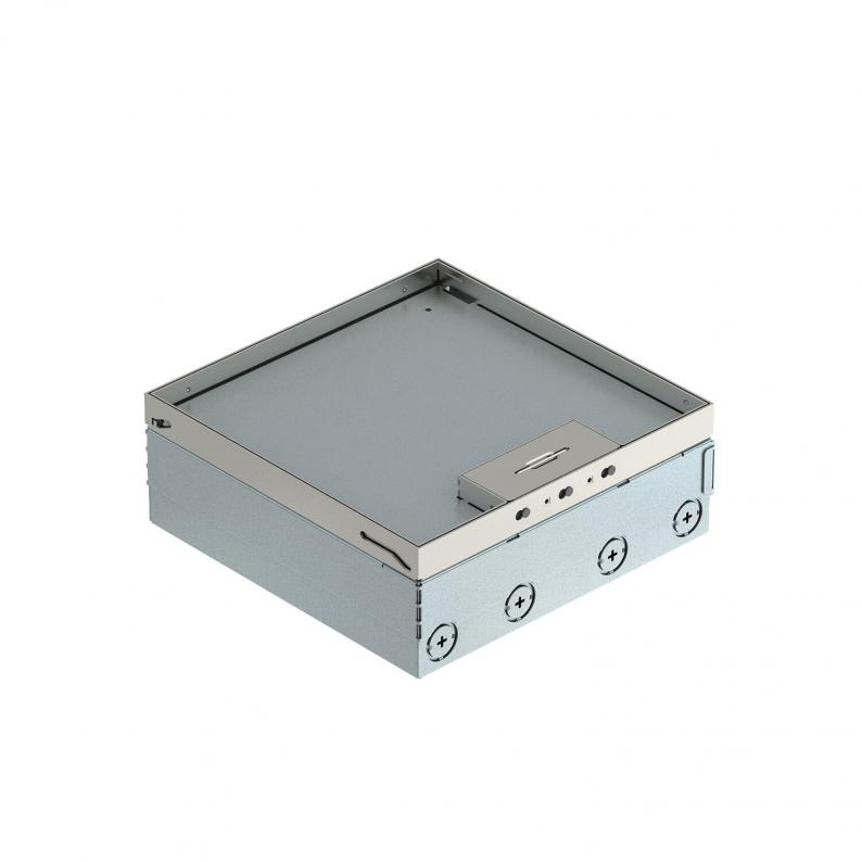 Square floor box for use in dry-cleaned cavity and screed floors in indoor areas. Installation housing with pre-marked insertion openings for pipes (M25). With three UT4 universal supports and two double sockets. Cover adjustable to top edge of floor covering using four height-adjustment supports. The minimum installation depth is 95 mm, the height-adjustment range + 30 mm.