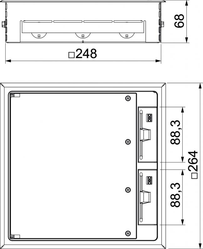 Square screed socket with GES9 UGE service outlet for use in screed floors for indoor use. With pre-marked insertion openings for pipelines (M20/M25) on all four sides.