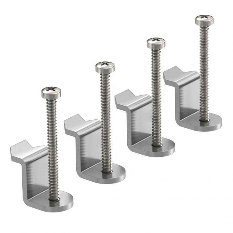 Four universal fastenings with folding clamping bracket for service outlets and junction box inserts of the generation -2 with four or eight system fastenings. Spare part.