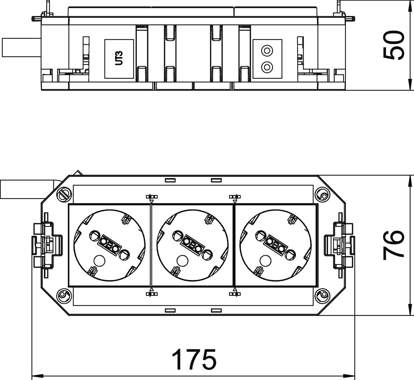 Ready-for-connection UTC3 universal support with halogen-free connection cable. It possesses two pre-installed 33° protective contact sockets in white and one pre-installed 33° protective contact socket in orange of 16 A. Suitable for VL connection cables and device installation units of nominal size 2, 4, R4, 6 and R7.
