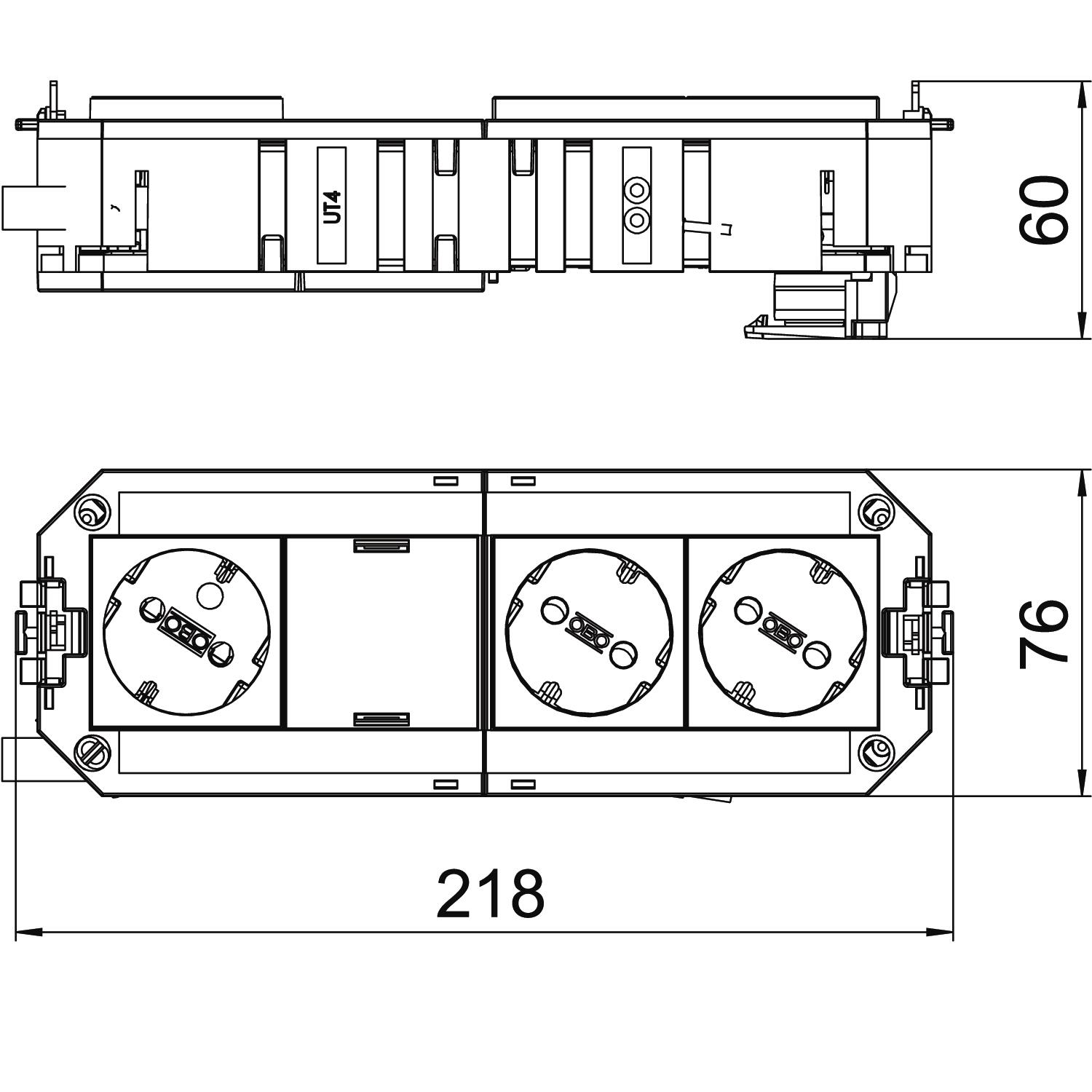 Ready-for-connection universal support UTC4 with halogen-free connection cable. It possesses two pre-installed 33° protective contact sockets in orange and one 33° protective contact socket in mint green with 16 A. A blanking cover allows retroinstallation of one installation device of the Modul 45 or Modul 45connect series. Suitable for VL connection cables and device installation units of nominal size R7, R9 and 9.