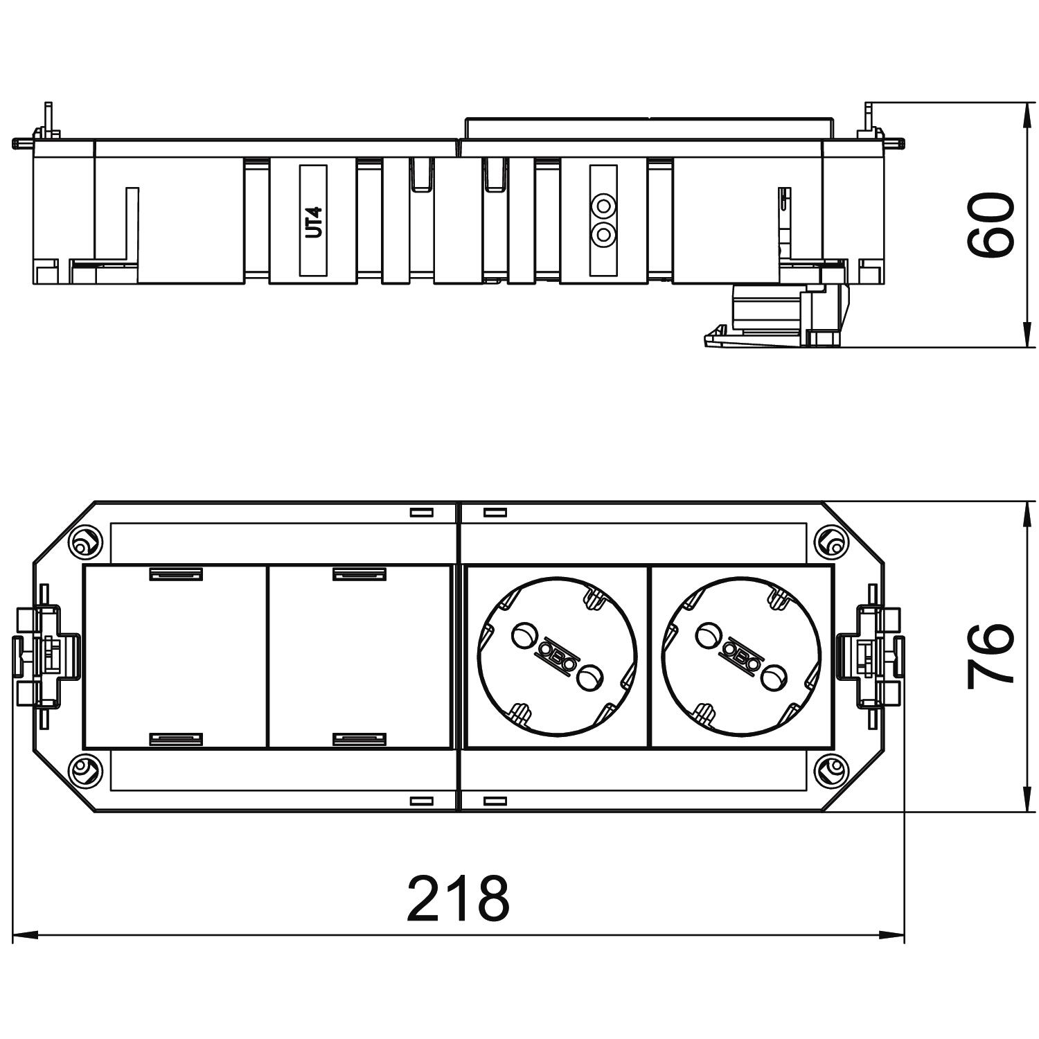 The ready-for-connection UTC4 universal support possesses two pre-installed 33° protective contact sockets of 16 A and two blanking covers for retroinstallation of two installation devices of the Modul 45 or Modul 45connect series. Suitable for VL connection cables and device installation units of nominal size R7, R9 and 9.