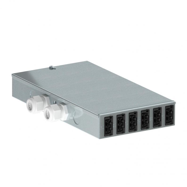 Output: 12 self-locking plug connectors, 3-pin, in white (6x) and black (6x), 25 A, type WINSTA® MIDI (socket part: 2x L1, 2x L2, 2x L3 for each rotary current circuit).