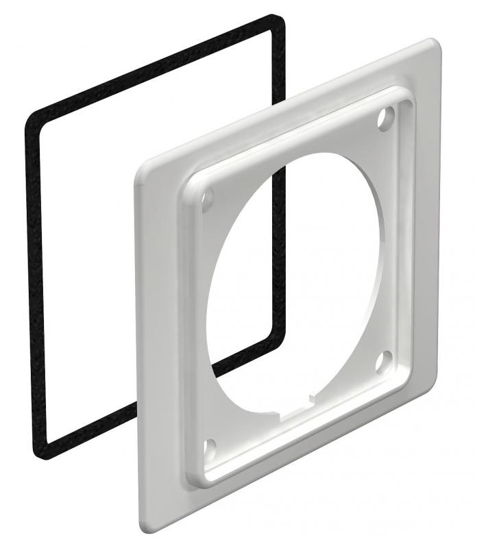 Adapter flange for mounting CEE 16 A sockets. During the mounting of the CEE mounting box, the adapter flange is mounted behind the trunking cover for accessory mounting boxes. Suitable for 400 V CEE 16 A 5-pin 6h, art. no. 6109874.