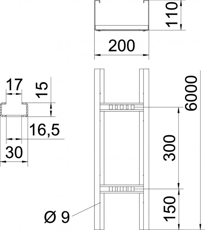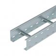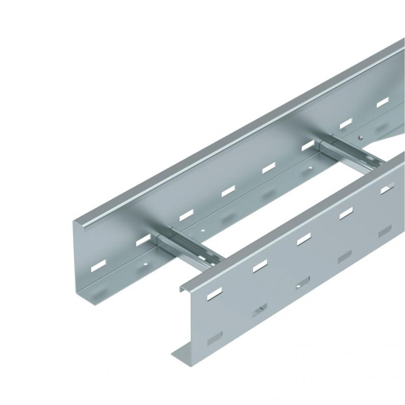 Wide span cable ladder with perforated side rails of side height of 110 mm. Fastening of cables with clamp clip, type 2056.