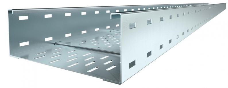Wide span cable tray system, perforated, with a side height of 110 mm.