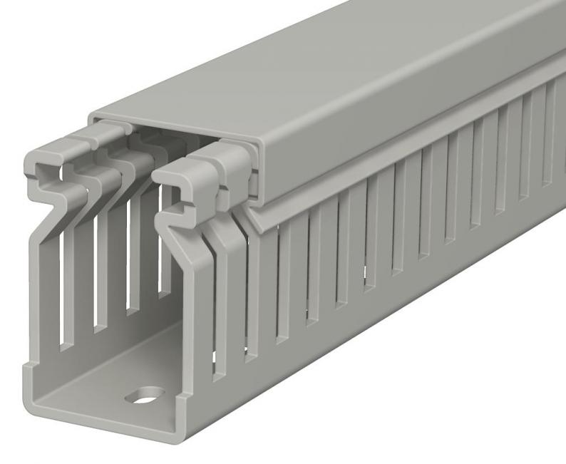 Wiring duct, incl. cover and base perforation, for horizontal and vertical routing of electrical cables in the switchgear cabinet. Designed as a metric duct. The nominal dimension of the system size corresponds to the internal dimension of the duct. Retainers are broken out without tools. The flush-floor routing of cables is possible through predetermined break points. Tested to DIN EN 50085-2-3. Special lengths on request.