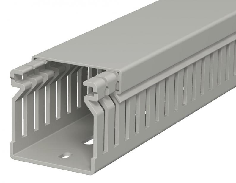 Wiring duct, incl. cover and base perforation, for horizontal and vertical routing of electrical cables in the switchgear cabinet. Designed as a metric duct. The nominal dimension of the system size corresponds to the internal dimension of the duct. Retainers are broken out without tools. The flush-floor routing of cables is possible through predetermined break points. Tested to DIN EN 50085-2-3. Special lengths on request.