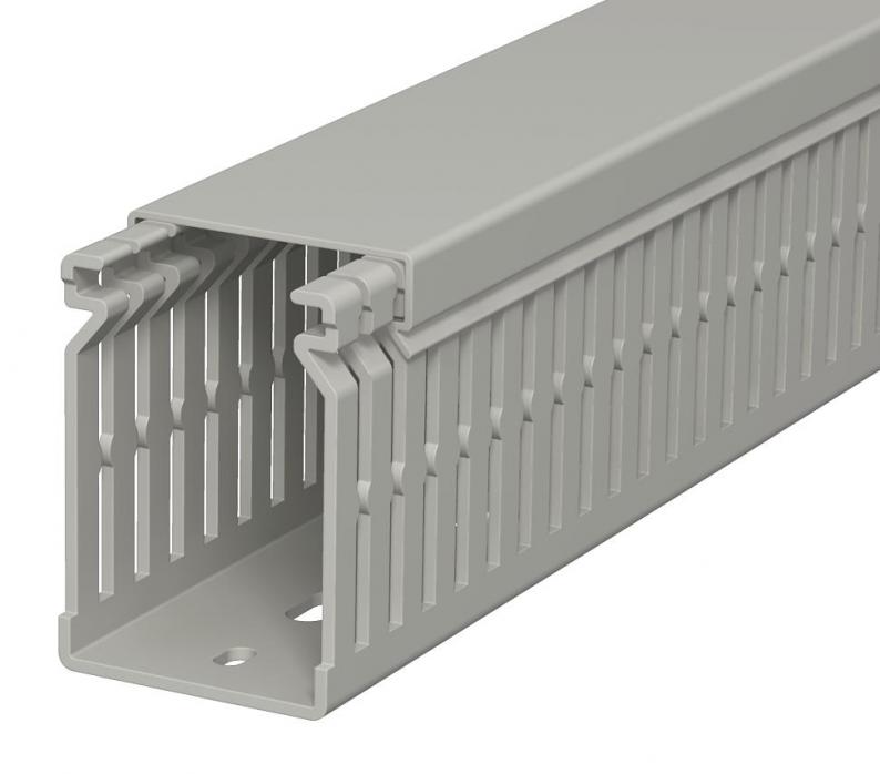 Wiring duct, incl. cover and base perforation, for horizontal and vertical routing of electrical cables in the switchgear cabinet. Designed as a metric duct. The nominal dimension of the system size corresponds to the internal dimension of the duct. Retainers are broken out without tools. The flush-floor routing of cables is possible through predetermined break points. Tapering in the side slots prevents the cables from falling out. Tested to DIN EN 50085-2-3. Special lengths on request.