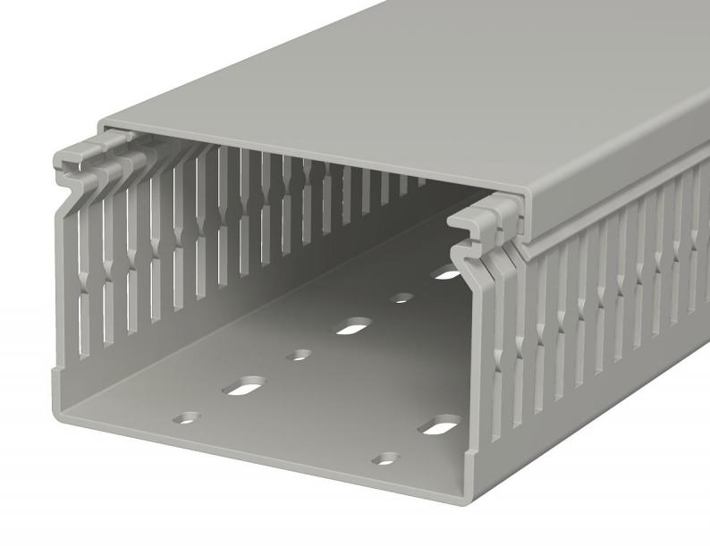 Wiring duct, incl. cover and base perforation, for horizontal and vertical routing of electrical cables in the switchgear cabinet. Designed as a metric duct. The nominal dimension of the system size corresponds to the internal dimension of the duct. Retainers are broken out without tools. The flush-floor routing of cables is possible through predetermined break points. Tapering in the side slots prevents the cables from falling out. Tested to DIN EN 50085-2-3. Special lengths on request.