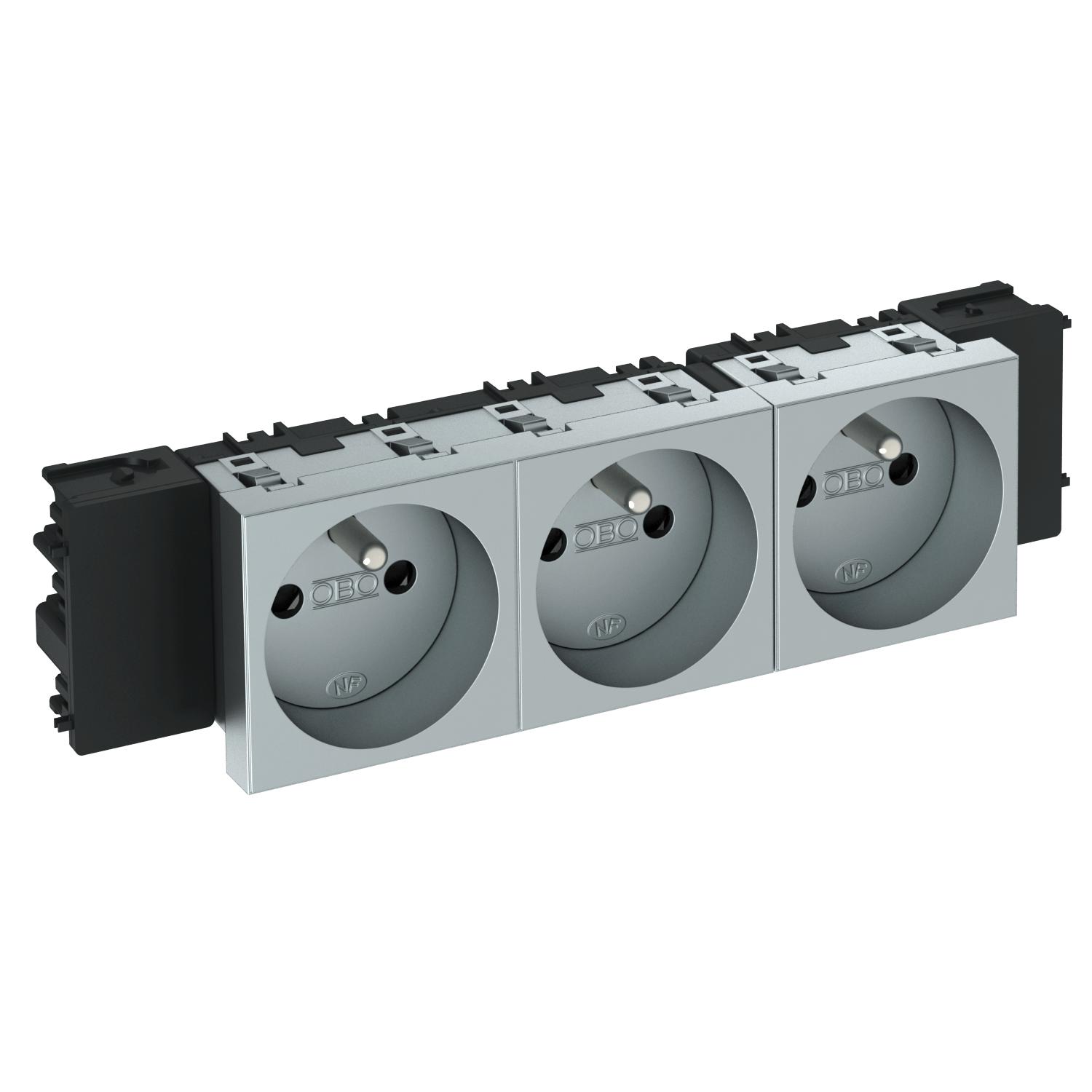 Approvals VDE Closable no CO2 Footprint (GWP) Cradle-to-Gate 0,605 kg CO2e / 1 Piece Coding no Colour Aluminium painted Connection type Screwless terminal Cover Central plate Depth 39 mm Dimension 250V, 10/16A Ejection mechanism no Error current protection no Fastening type Lock For more difficult conditions (according to VDE) no Halogen-free yes Height 45 mm Hinged cover no increased touch protection yes Insulated installation no Labelling panel no Material Polycarbonate Mounting type Device installation duct Nominal current 16 A Nominal voltage 250 V Number of poles 2 Number of units 3 Operating temperature, max. 40 °C Operating temperature, min. -5 °C Printed label/coding Without printing Protection rating Other Rotated central insert no Socket angle 0° Socket version NF Special power supply Without special power supply Surface version Matt Surge protection no Transparent no Version for Triple 0° Warning light no Width 176 mm With fine-wire fuse no With functional lighting no With on/off switch no With orientation lighting no - All types
