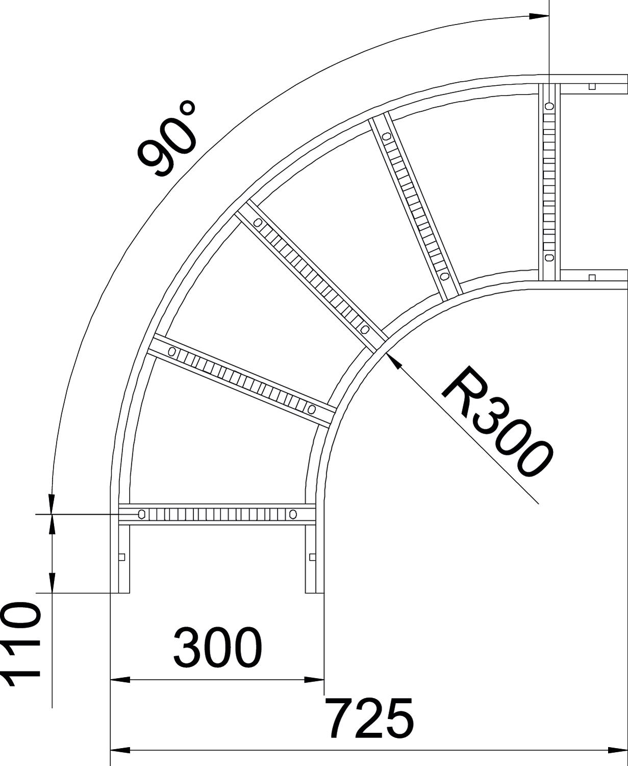 Product description90° bend, horizontal, with welded rung for all cable ladder types of 110 mm side height.