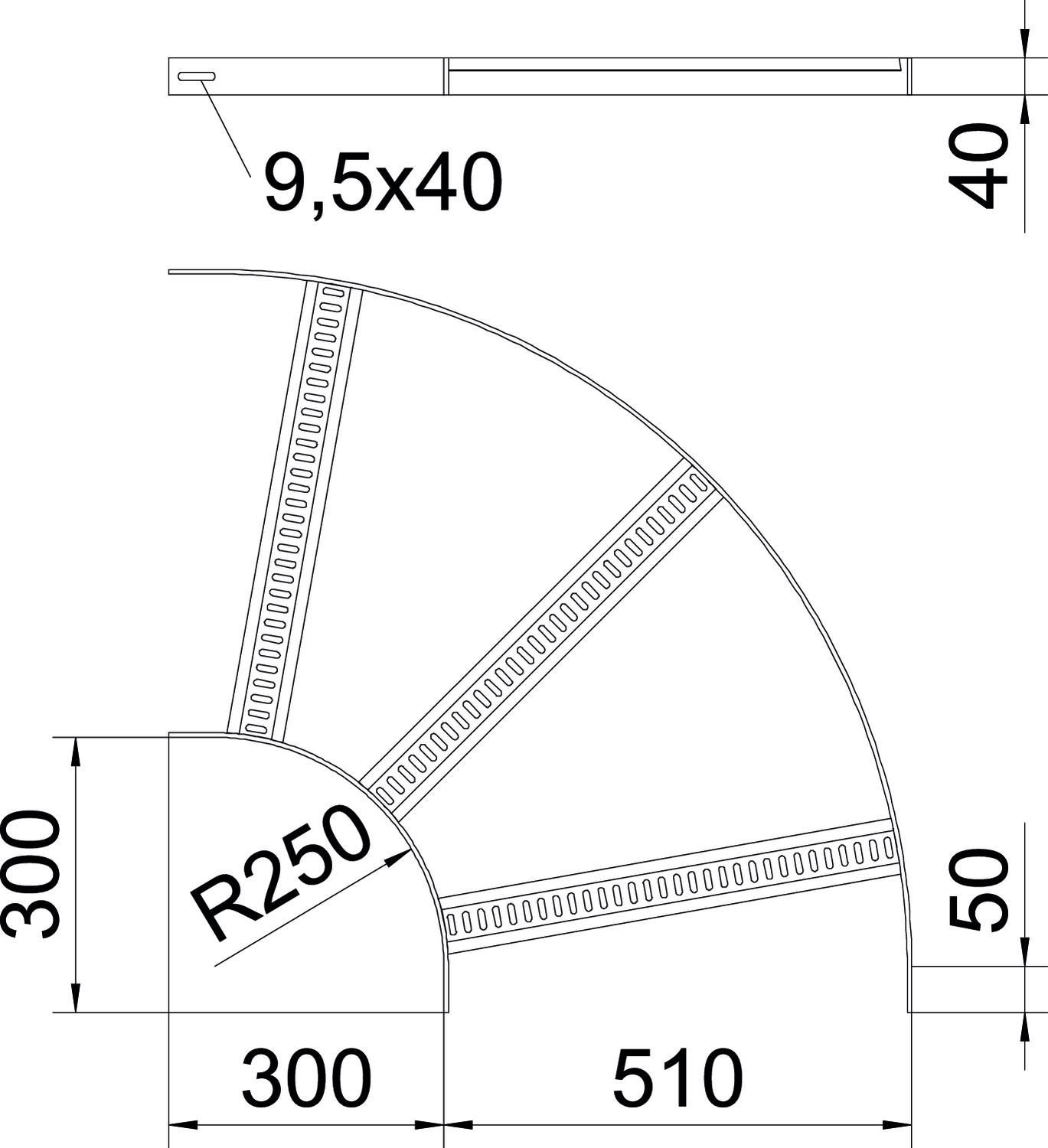 Bend (angle) 90° Change of direction Horizontal Colour aluminium Connector version Without connectors Dimension B510mm Height 40 mm Hinged no Maintain electrical functions no Material Aluminium Rail thickness 5 mm Rustproof steel, pickled yes Side perforation no Side rail version Flat profile Surface Pickled Version of the rungs Profile perforated Wide-span version no Width 500 mm - All types