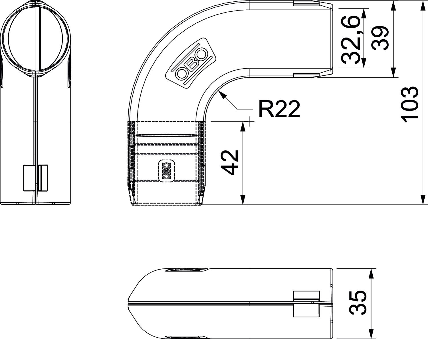 Angle of the bend 90 ° Brushed surface no CO2 Footprint (GWP) Cradle-to-Gate 0,1427 kg CO2e / 1 Piece Colour Light grey; RAL 7035 Dimension M32 Dimension B 38,8 mm Dimension d 32,6 mm Dimension L 103 mm Dimension L1 42 mm Dimension R 22 mm Flexible no Halogen-free yes Material Polypropylene Permitted temperature range, max. 60 °C Polished surface no Two-part yes Version for Connector With inspection opening and lid no With sleeve no - All types