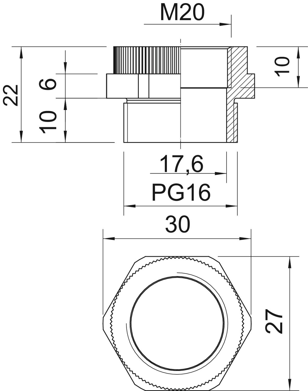 CO2 Footprint (GWP) Cradle-to-Gate 0,0315 kg CO2e / 1 Piece Colour Light grey; RAL 7035 Dimension PG16-M20 Dimension D 17,6 mm Dimension E 30 mm Dimension L 22 mm Dimension L1 10 mm Dimension L2 6 mm Dimension L3 10 mm explosion-proof no Material Polyamide Nickel-plated no Thread dimension, metric, internal 20 Thread dimension, PG, external 16 Thread type: External thread PG Thread type: Internal thread Metric WAF 27 - All types