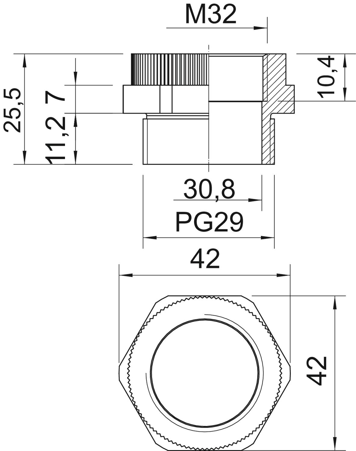 CO2 Footprint (GWP) Cradle-to-Gate 0,0772 kg CO2e / 1 Piece Colour Light grey; RAL 7035 Dimension PG29-M32 Dimension D 30,8 mm Dimension E 42 mm Dimension L 25,5 mm Dimension L1 11,2 mm Dimension L2 7 mm Dimension L3 10,4 mm explosion-proof no Material Polyamide Nickel-plated no Thread dimension, metric, internal 32 Thread dimension, PG, external 29 Thread type: External thread PG Thread type: Internal thread Metric WAF 42 - All types