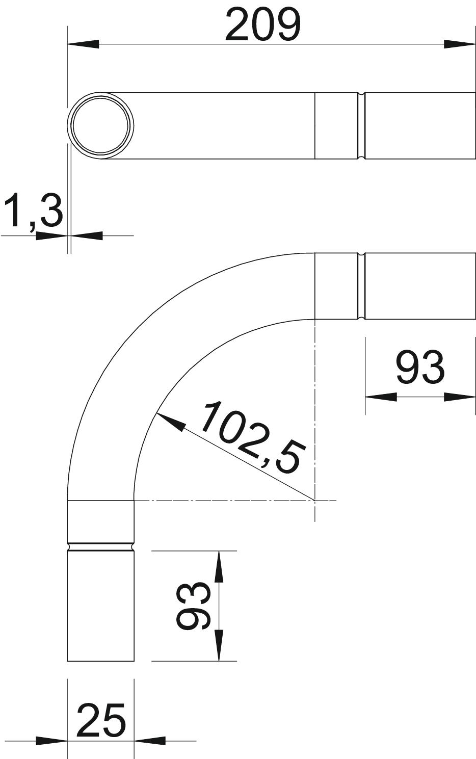 Angle of the bend 90 ° Brushed surface no Dimension Ø25mm Dimension A 93 mm Dimension B 209 mm Dimension D 25,2 mm Dimension l 38 mm Dimension m (mm) M25 Dimension R 90 mm Dimension t 1,3 mm Flexible no For nominal pipe diameter 25 mm Halogen-free no Material Aluminium Permitted temperature range, max. 250 °C Permitted temperature range, min. -45 °C Polished surface no Two-part no Version for Connector With inspection opening and lid no With sleeve yes - All types