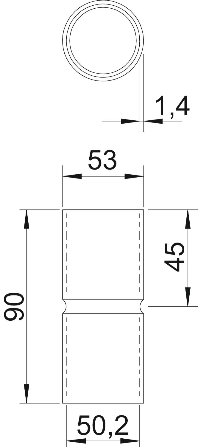 Brushed surface no Dimension Ø50mm Dimension D 53 mm Dimension d 50,2 mm Dimension L 90 mm Dimension l 45 mm Dimension t 1,4 mm for pipe diameter 50 mm Halogen-free yes Length 90 mm Material Aluminium Permitted temperature range, max. 250 °C Permitted temperature range, min. -45 °C Polished surface no Size 50 Two-part no Version for Connector With inspection opening and lid no - All types