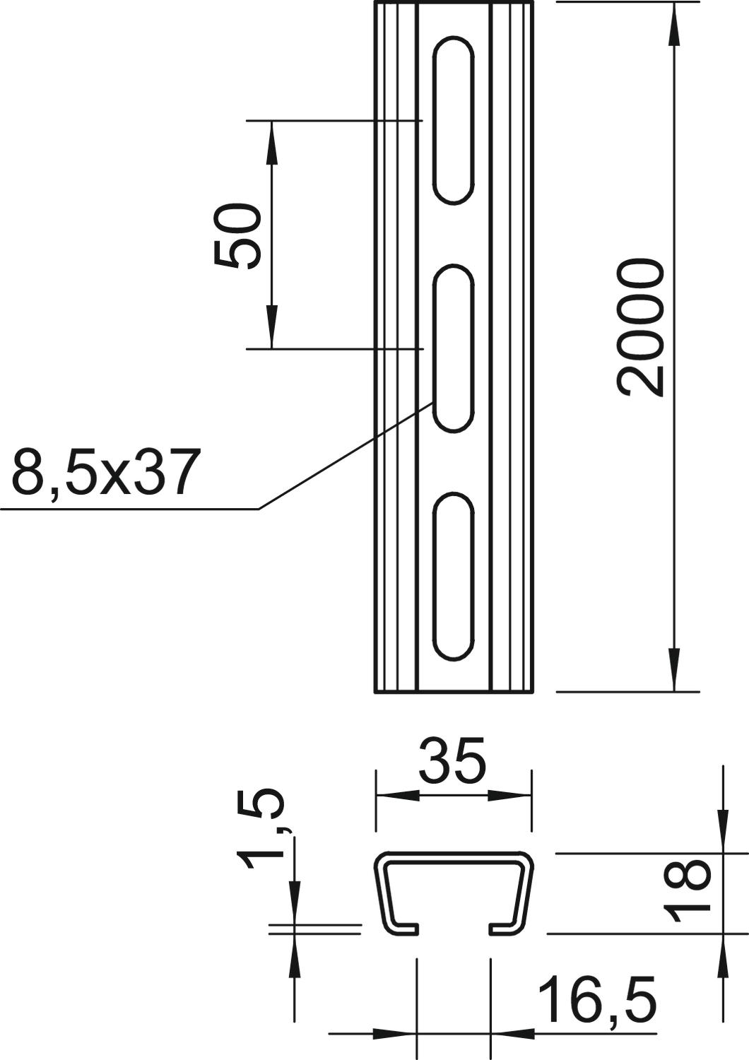 Breakable no Bundle 20 m CO2 Footprint (GWP) Cradle-to-Gate 2,0259 kg CO2e / 1 Meter Dimension 2000x35x18 Dimension L 2000 mm Drill hole spacing, centre 50 mm Height 18 mm Length 2000 mm Maintain electrical functions yes Material Steel Material thickness 1,5 mm Profile shape C profile Slot width 16,5 mm Static value A 1,01 cm² Static value ly 0,44 cm⁴ Static value lz 1,84 cm⁴ Static value Wy 0,42 cm³ Static value Wz 1,05 cm³ Surface Strip galvanized Type of perforation Perforated back Version for Single profile Width 35 mm With perforation yes With toothing no - All types