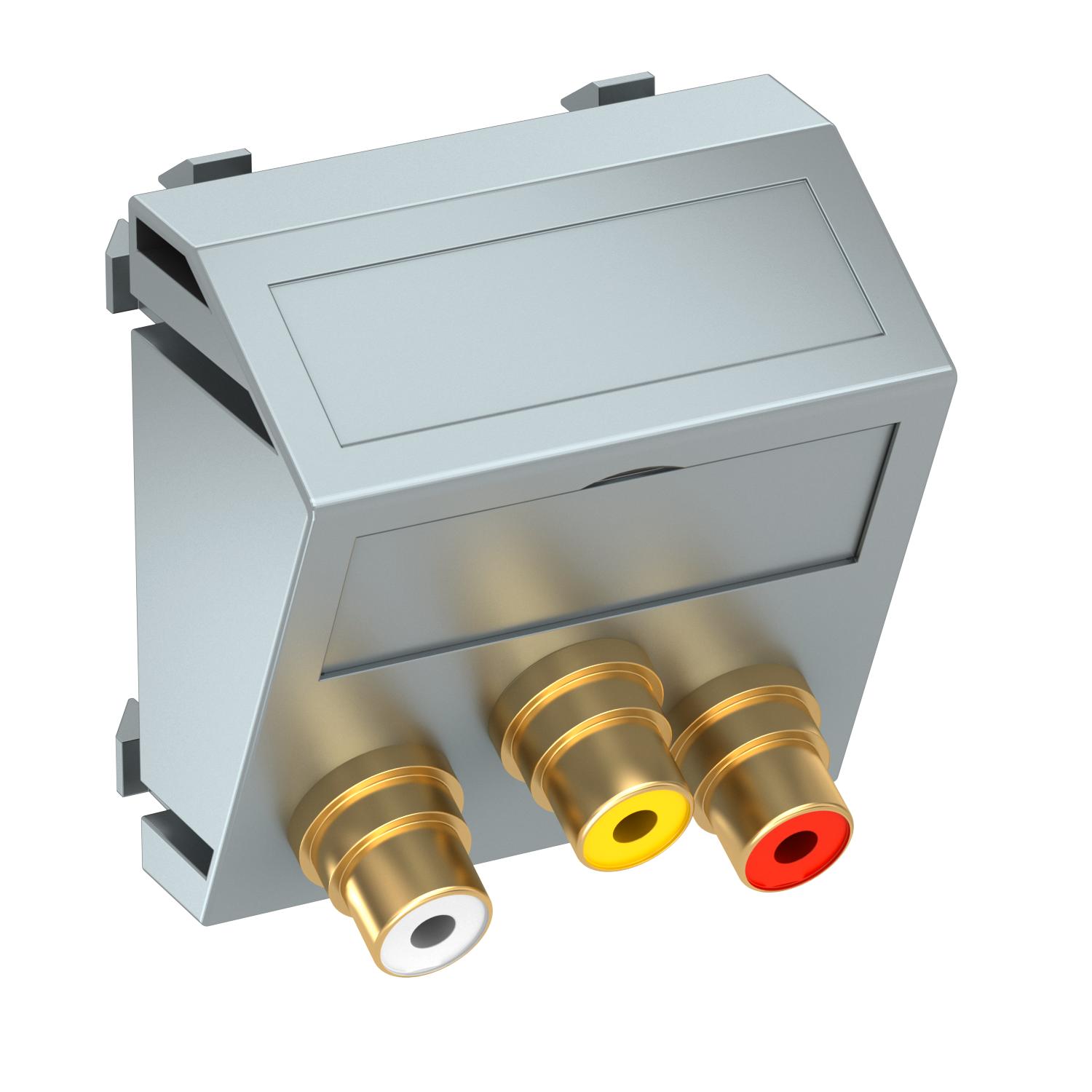 Product descriptionMultimedia support with three cinch connection sockets for audio/video, slanting cable outlet, with labelling panel, three cinch sockets (RCA) with soldered connection, colour coding yellow / red / white. Support plate with locking fastening, suitable for horizontal and vertical installation in the system environment.