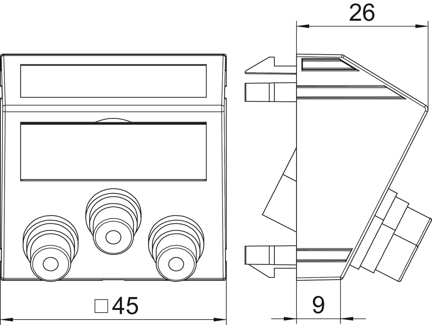 Product descriptionMultimedia support with three cinch connection sockets for audio/video, slanting cable outlet, with labelling panel, three cinch sockets (RCA) with soldered connection, colour coding yellow / red / white. Support plate with locking fastening, suitable for horizontal and vertical installation in the system environment.