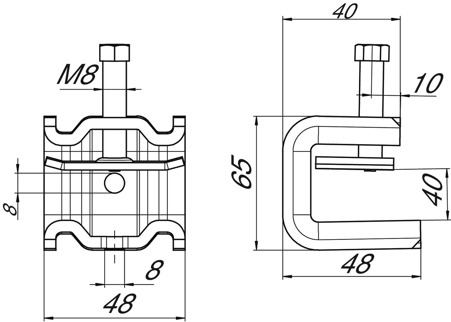 Product descriptionThis type of support clamp is pushed onto the support and fixed to the girder or flat iron using a pressure trough and bolt (M8).The hexagonal bolt has a WAF of 10 mm. In the clip element also two more M8 threads are introduced, for example to attach threaded rods.