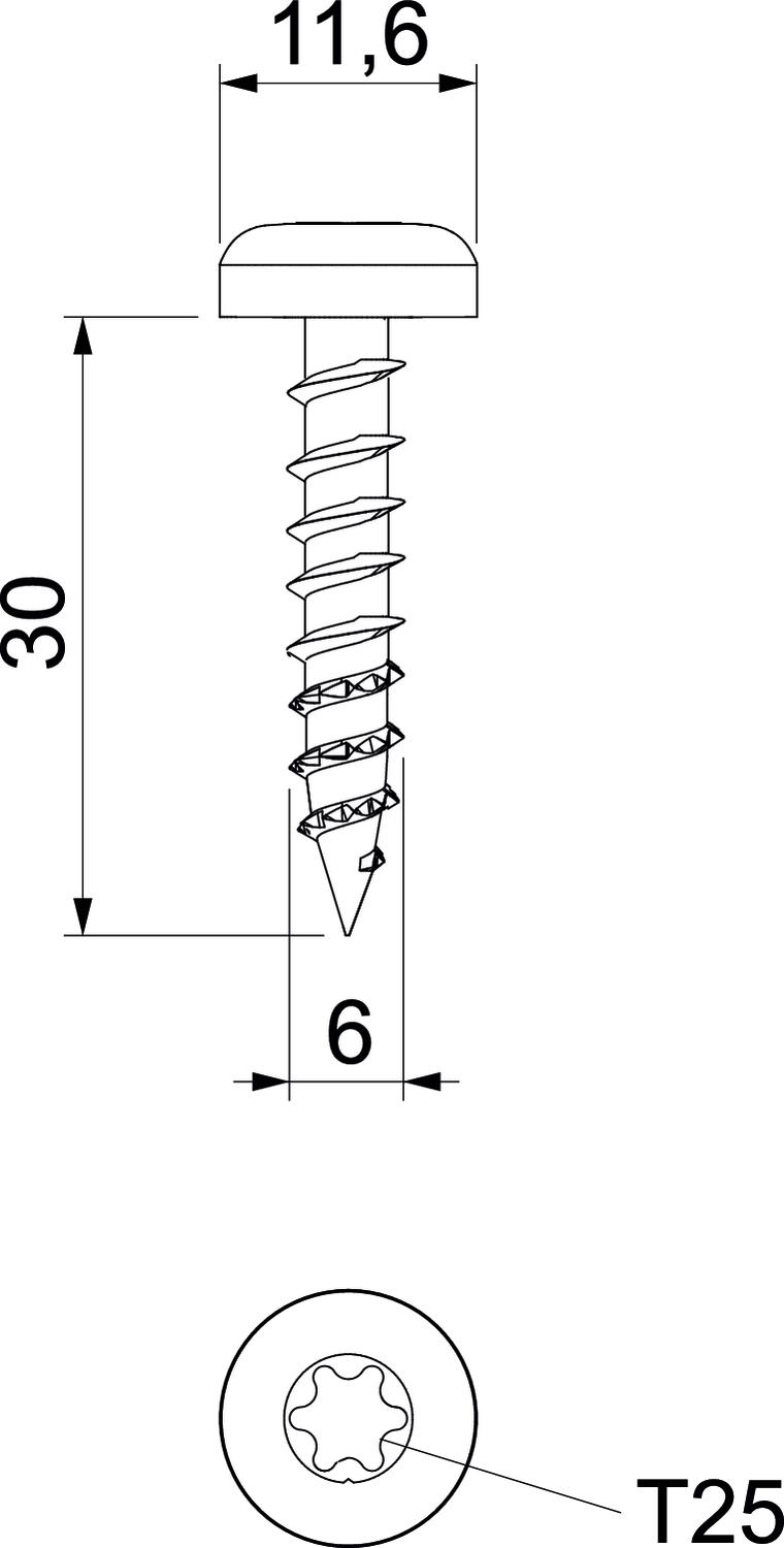 Colour zinc Dimension 6x30 Dimension d 6 mm Dimension D 11,6 mm Dimension L 30 mm Head shape Miscellaneous Material Steel Screw system Torx Surface Electrogalvanized, transparently passivated Thread diameter ST 6 - All types