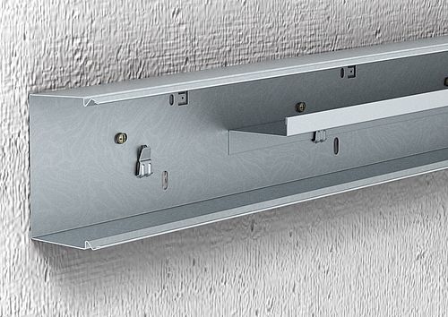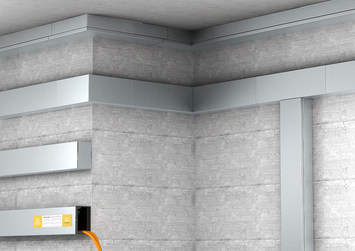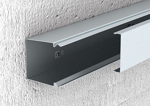 The LKM cable trunking is also suitable for horizontal wall and ceiling mounting. With type LKM60100 trunking, a retaining clamp can prevent the cables from falling out. Once the cable installation has been completed, the trunking cover is locked onto the trunking base with ultimate ease. The equipotential bonding between the cover and base and between the trunking lengths is guaranteed without the use of additional connection cables. This saves time and offers reliable protection.