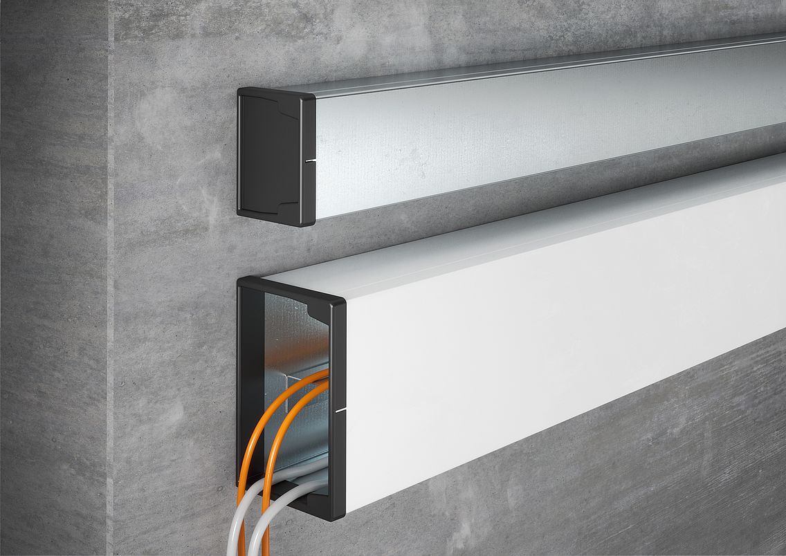The edge protection rings of the LKM system can be retroinstalled in an uncomplicated manner – even if the trunking is already mounted on the wall or even if it is already equipped with cables. The attractive appearance and the user-friendly handling are the hallmarks of the edge protection rings, which are made from halogen-free material. Closed end pieces are available in the same design.