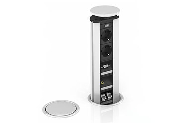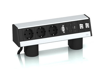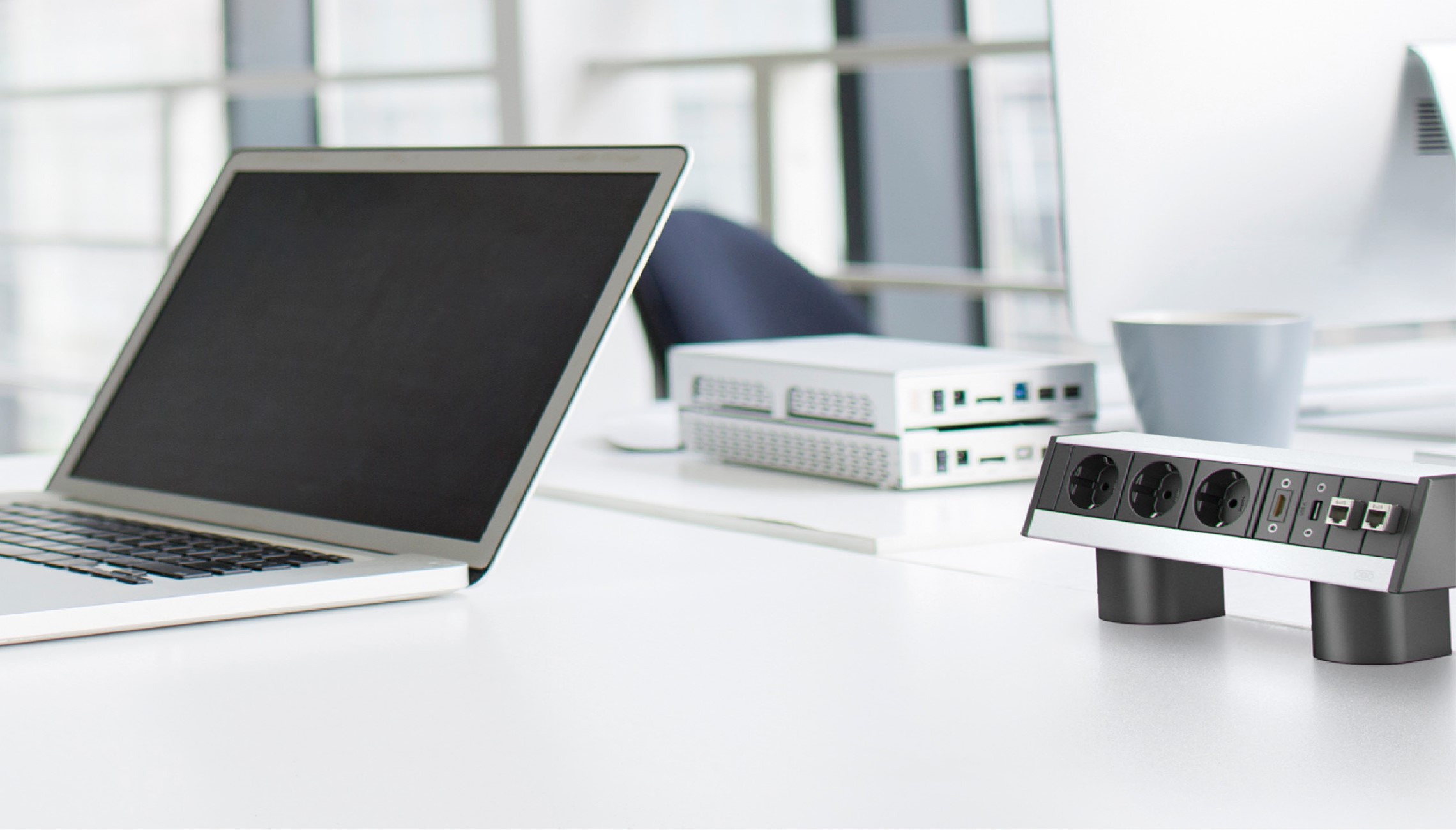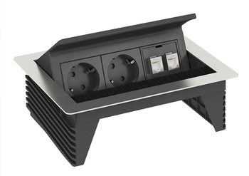 The lowerable Deskbox ensures an unnoticed supply with power and data. When closed, it is flat and discreet on the tabletop. If necessary, the Deskbox DBV can simply be pulled out – the appropriate plug connections are then easy to reach.