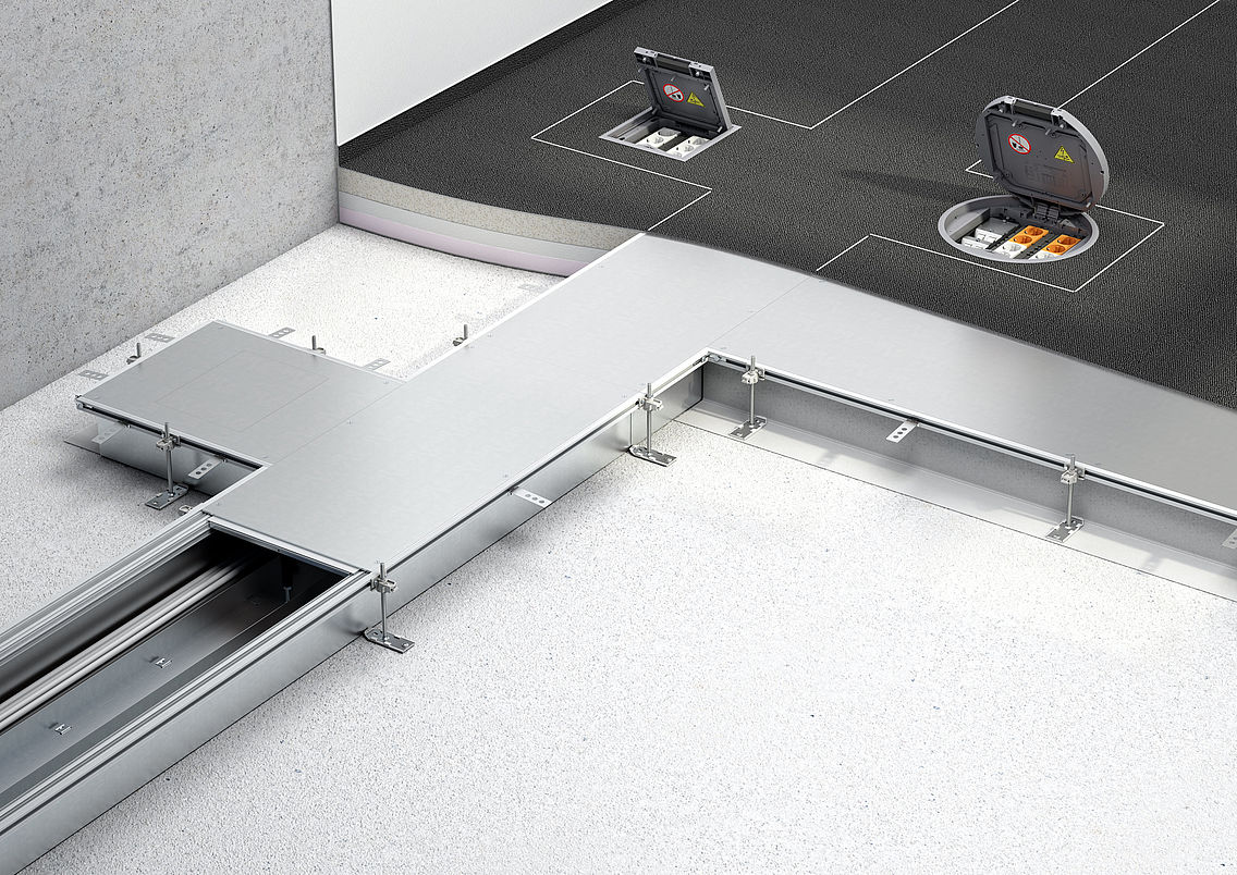 The OKA open trunking system is a flexible system for in-screed cable routing. The trunking covers can also be opened along the whole length ‒ even when installed with a floor covering. This means that the electrical installation in the floor-flush trunking can be adapted at any time. This means that the system is particularly suitable for users with continually changing requirements for the cable system. Additional mounting benefits, such as lowerable floor covering profiles or rapid height-adjustment units, offer a great deal of flexibility and speed for professional underfloor installations. It is ideally suited for the routing of large volumes of cables, even in low floor structures, and for device installation.