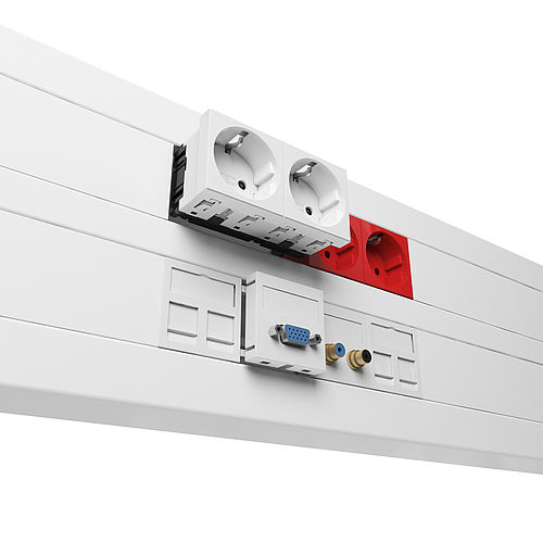 Switches, sockets and data technology elements of the OBO Modul 45 and Modul 45connect series are the perfect complement to the Rapid 45-2. They can simply be clicked into the trunking profile with just one movement. It is a compact system, which can be mounted quickly and expanded easily. Compared with standard installation types, the cost of installing the devices is considerably lower. No additional components, such as accessory mounting boxes, adapters or cover frames, are required.
