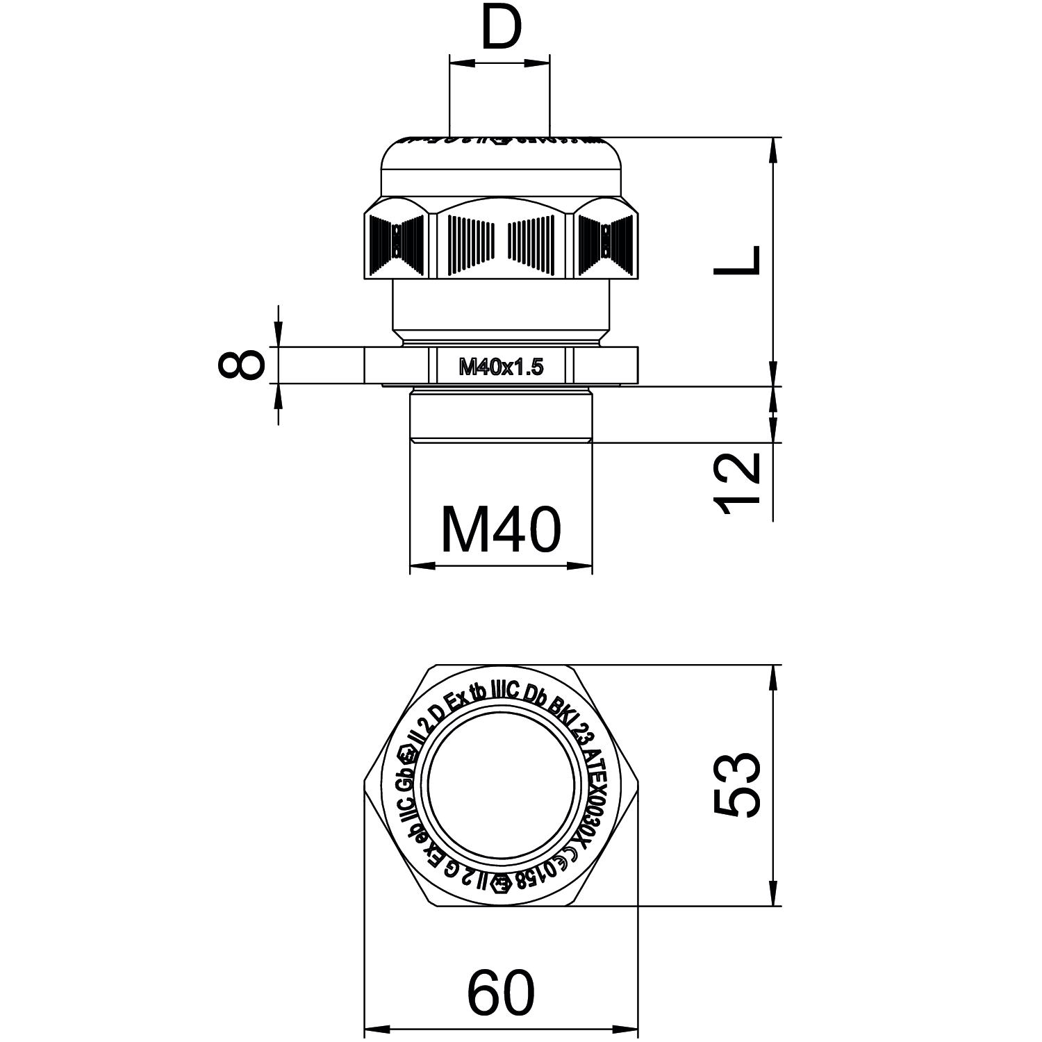 Bend protection no CO2 Footprint (GWP) Cradle-to-Gate 0,3243 kg CO2e / 1 Piece Colour Black Dimension M40 Dimension E 60 mm Dimension G M40 mm Dimension L max. 54 mm Dimension L min. 39 mm Dimension L1 13 mm Dimension L2 8 mm explosion-proof yes Fibre-glass reinforced no Flat cable gland no For Ex zone yes For Ex zone dust 21, 22 For Ex zone gas 1, 2 Halogen-free yes Hexagonal corner dimension 60 mm Impact-resistant no Material Polyamide Nominal thread size 40 Permitted temperature range, max. 65 °C Permitted temperature range, min. -20 °C Protection rating IP68 Sealing area D, max. 32 mm Sealing area D, min. 25 mm Sealing insert, multiple no Splittable gland no Strain relief option no Thread M40 x 1,5 Thread increase 1,5 mm Thread length 13 mm Thread type Metric Type of seal Sealing ring Unstable torque 15 Nm Version for Straight WAF 53 With locknut no - All types