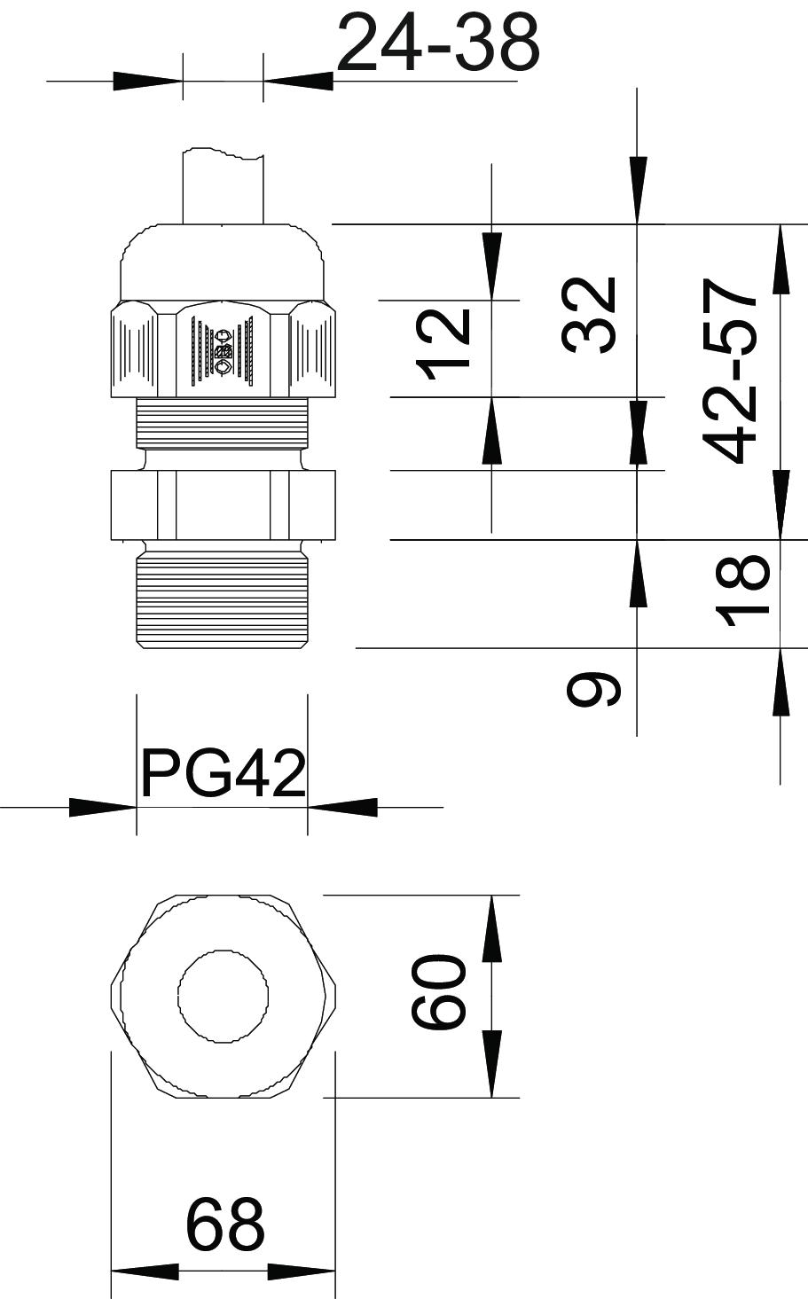 Bend protection no CO2 Footprint (GWP) Cradle-to-Gate 0,4733 kg CO2e / 1 Piece Colour Light grey; RAL 7035 Dimension PG42 Dimension E 68 mm Dimension L max. 57 mm Dimension L min. 42 mm Dimension L1 18 mm Dimension L2 9 mm Dimension L3 32,5 mm explosion-proof no Fibre-glass reinforced no Flat cable gland no For Ex zone Without For Ex zone dust Without For Ex zone gas Without Halogen-free yes Impact-resistant no Material Polyamide Nominal thread size 42 Permitted temperature range, max. 65 °C Permitted temperature range, min. -20 °C Protection rating IP68 Sealing area D, max. 38 mm Sealing area D, min. 24 mm Sealing insert, multiple no Splittable gland no Strain relief option yes Thread Pg 42 Thread increase 1,5 mm Thread length 18 mm Thread type PG Type of seal Sealing ring Unstable torque 5 Nm Version for Straight WAF 60 With locknut no - All types