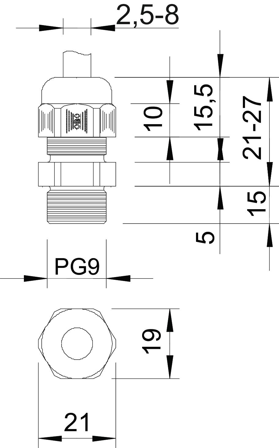 Bend protection no CO2 Footprint (GWP) Cradle-to-Gate 0,0431 kg CO2e / 1 Piece Colour Light grey; RAL 7035 Dimension PG9 Dimension E 21 mm Dimension L max. 27 mm Dimension L min. 21 mm Dimension L1 15 mm Dimension L2 5 mm Dimension L3 15,5 mm explosion-proof no Fibre-glass reinforced no Flat cable gland no For Ex zone Without For Ex zone dust Without For Ex zone gas Without Halogen-free yes Hexagonal corner dimension 21 mm Impact-resistant no Material Polyamide Nominal thread size 9 Permitted temperature range, max. 65 °C Permitted temperature range, min. -20 °C Protection rating IP68 Sealing area D, max. 8 mm Sealing area D, min. 2,5 mm Sealing insert, multiple no Splittable gland no Strain relief option yes Thread Pg 9 Thread increase 1,5 mm Thread length 15 mm Thread type PG Type of seal Sealing ring Unstable torque 2,5 Nm Version for Straight WAF 19 With locknut no - All types