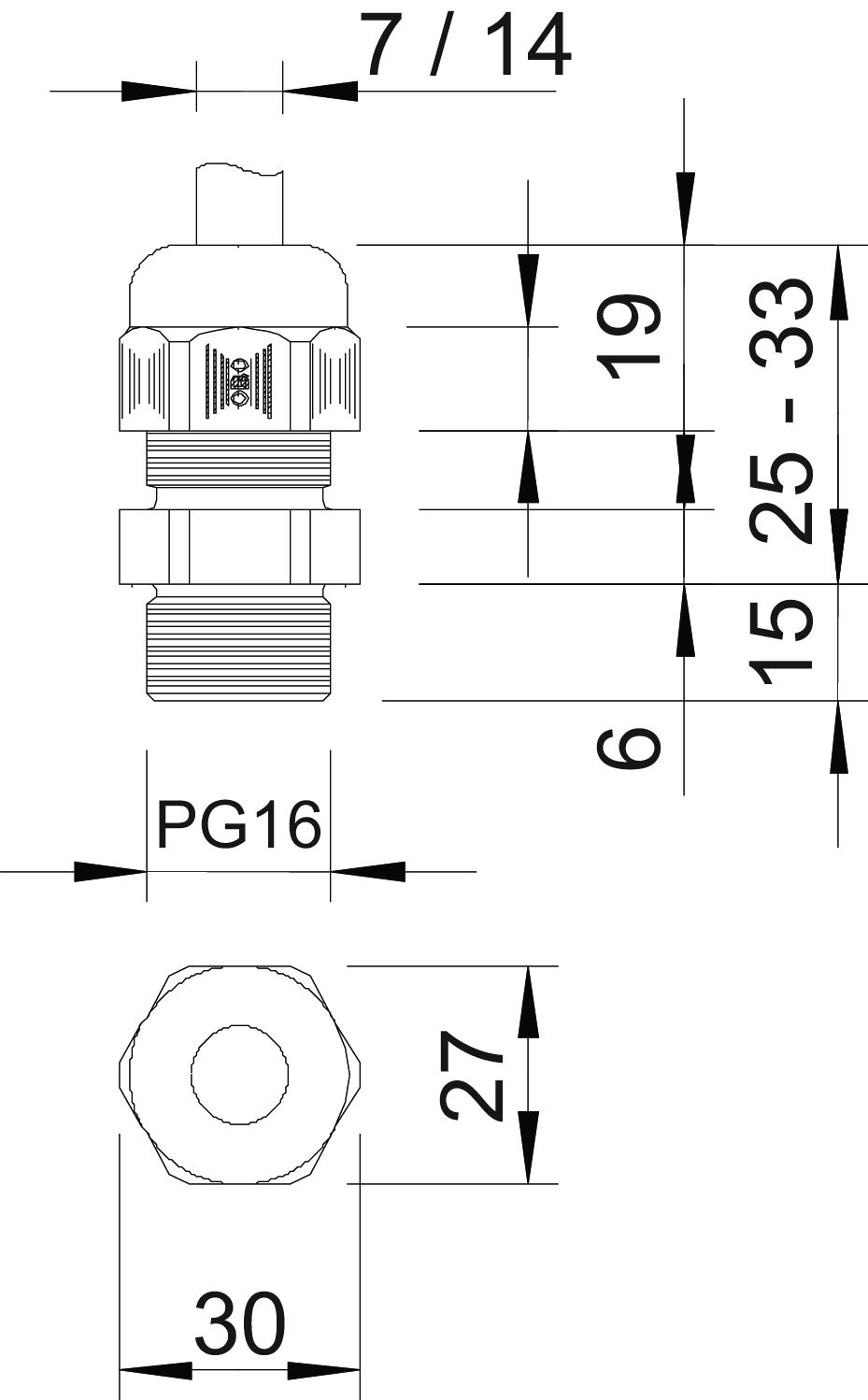 Bend protection no CO2 Footprint (GWP) Cradle-to-Gate 0,076 kg CO2e / 1 Piece Colour Silver grey; RAL 7001 Dimension PG16 Dimension E 30 mm Dimension L max. 33 mm Dimension L min. 25 mm Dimension L1 15 mm Dimension L2 6 mm Dimension L3 19 mm explosion-proof no Fibre-glass reinforced no Flat cable gland no For Ex zone Without For Ex zone dust Without For Ex zone gas Without Halogen-free yes Hexagonal corner dimension 30 mm Impact-resistant no Material Polyamide Nominal thread size 16 Permitted temperature range, max. 65 °C Permitted temperature range, min. -20 °C Protection rating IP68 Sealing area D, max. 14 mm Sealing area D, min. 7 mm Sealing insert, multiple no Splittable gland no Strain relief option yes Thread Pg 16 Thread increase 1,5 mm Thread length 15 mm Thread type PG Type of seal Sealing ring Unstable torque 3,67 Nm Version for Straight WAF 27 With locknut no - All types