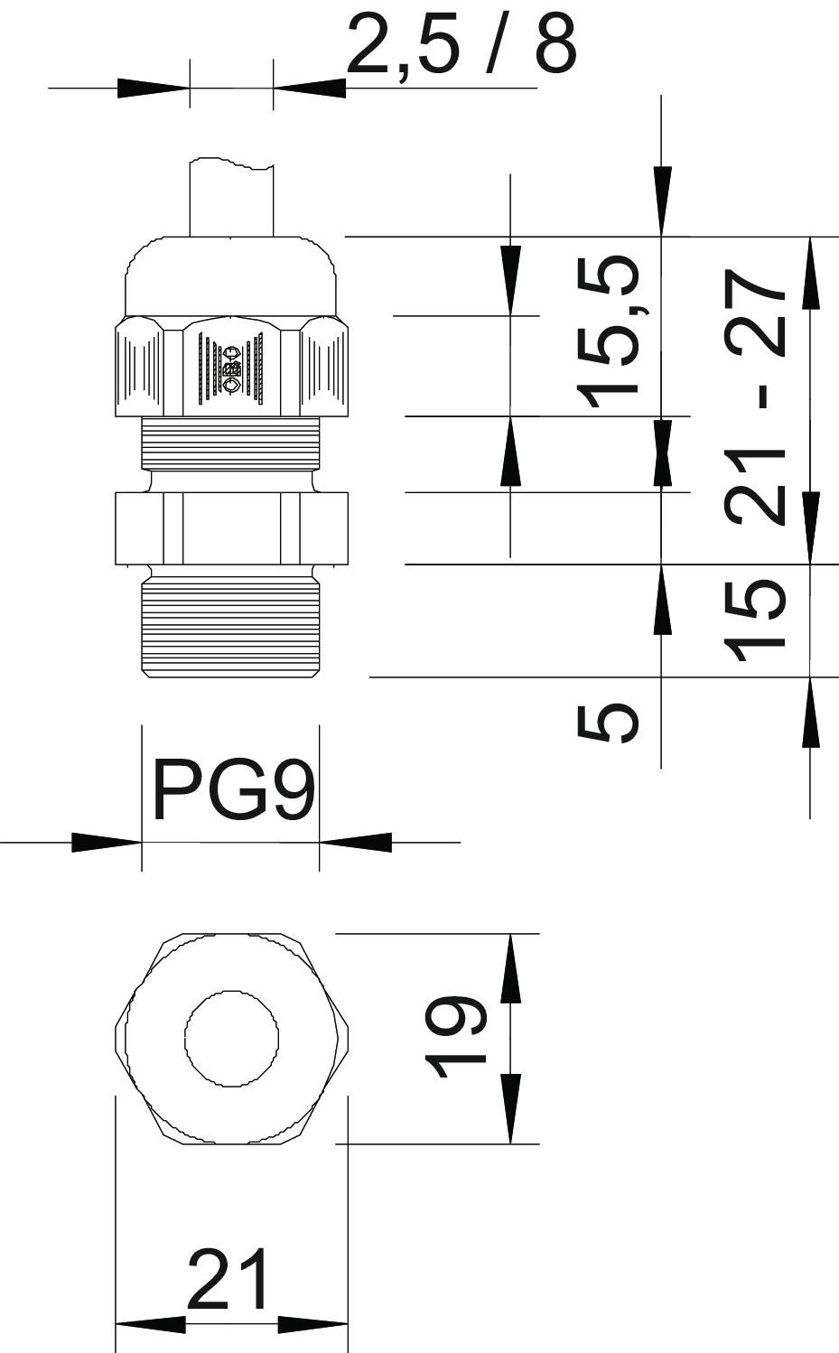 Bend protection no CO2 Footprint (GWP) Cradle-to-Gate 0,0362 kg CO2e / 1 Piece Colour Silver grey; RAL 7001 Dimension PG9 Dimension E 21 mm Dimension L max. 27 mm Dimension L min. 21 mm Dimension L1 15 mm Dimension L2 5 mm Dimension L3 15,5 mm explosion-proof no Fibre-glass reinforced no Flat cable gland no For Ex zone Without For Ex zone dust Without For Ex zone gas Without Halogen-free yes Hexagonal corner dimension 21 mm Impact-resistant no Material Polyamide Nominal thread size 9 Permitted temperature range, max. 65 °C Permitted temperature range, min. -20 °C Protection rating IP68 Sealing area D, max. 8 mm Sealing area D, min. 2,5 mm Sealing insert, multiple no Splittable gland no Strain relief option yes Thread Pg 9 Thread increase 1,5 mm Thread length 15 mm Thread type PG Type of seal Sealing ring Unstable torque 2,5 Nm Version for Straight WAF 19 With locknut no - All types