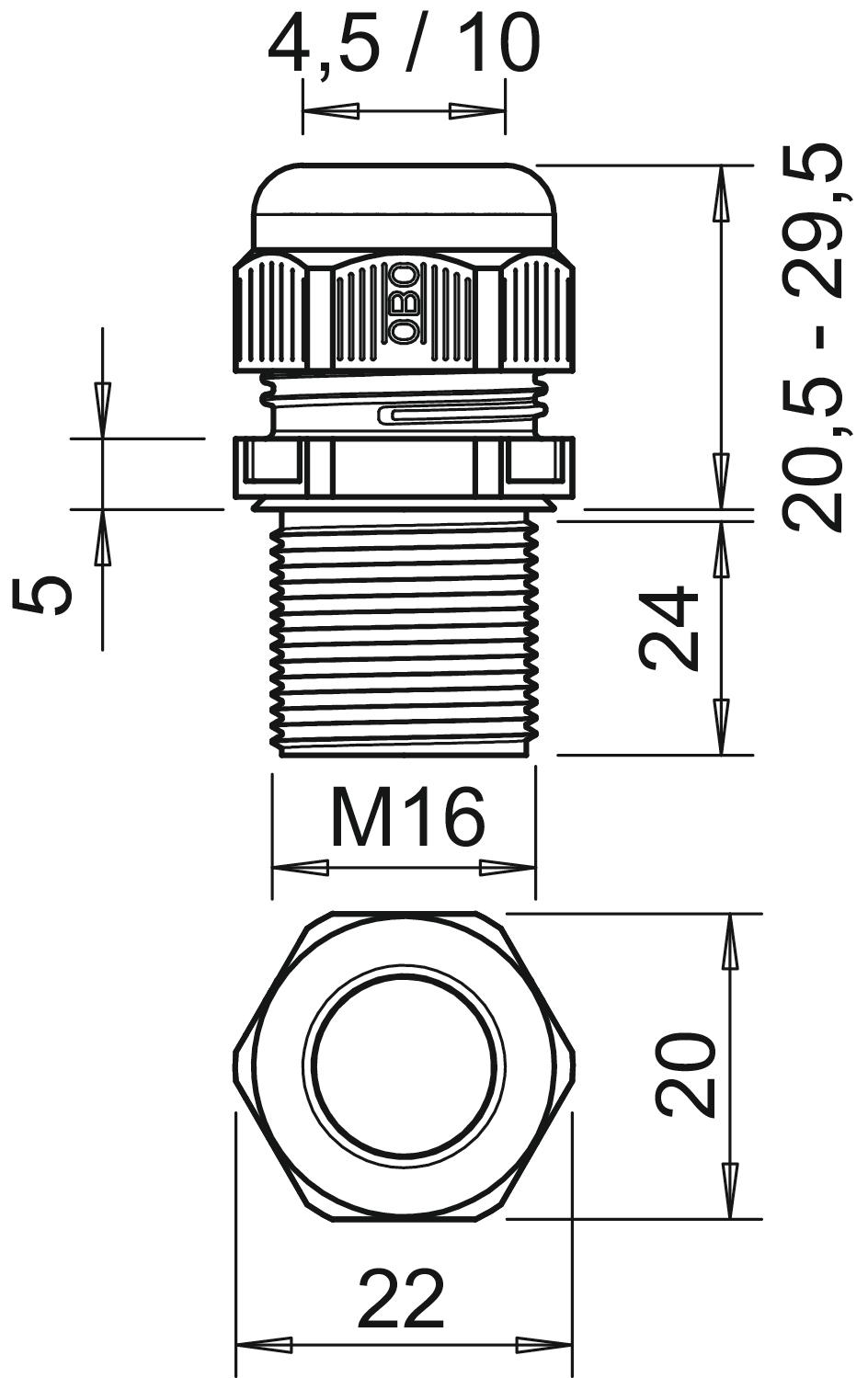 Bend protection no CO2 Footprint (GWP) Cradle-to-Gate 0,0447 kg CO2e / 1 Piece Colour Black Dimension M16 Dimension E 22 mm Dimension L max. 29,5 mm Dimension L min. 20,5 mm Dimension L1 24 mm Dimension L2 5 mm explosion-proof no Fibre-glass reinforced no Flame-resistant acc. to VDE 0471/DIN 695 Part 2-1, test temperature 650°C Flat cable gland no For Ex zone Without For Ex zone dust Without For Ex zone gas Without Halogen-free yes Hexagonal corner dimension 22 mm Impact-resistant no Material Polyamide Nominal thread size 16 Permitted temperature range, max. 65 °C Permitted temperature range, min. -20 °C Protection rating IP68 Sealing area D, max. 10 mm Sealing area D, min. 4,5 mm Sealing insert, multiple no Splittable gland no Strain relief option yes Thread M16 x 1,5 Thread increase 1,8 mm Thread length 24 mm Thread type Metric Type of seal Sealing ring Unstable torque 2,5 Nm Version for Straight WAF 20 With locknut no - All types