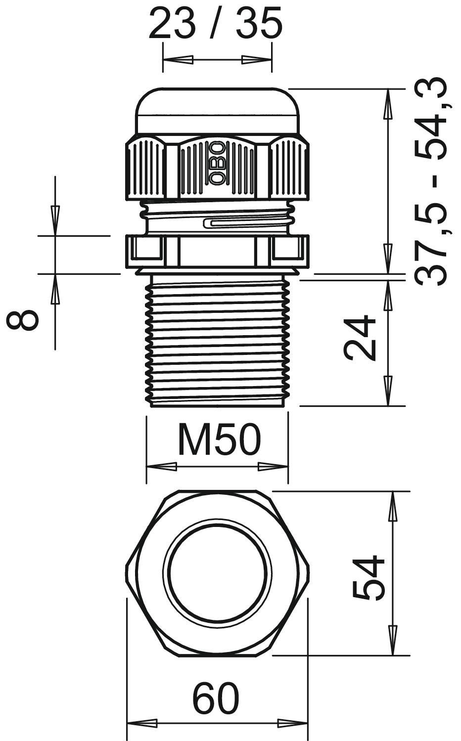 Bend protection no CO2 Footprint (GWP) Cradle-to-Gate 0,3138 kg CO2e / 1 Piece Colour Black Dimension M50 Dimension E 60 mm Dimension L max. 54,3 mm Dimension L min. 37,5 mm Dimension L1 24 mm Dimension L2 8 mm explosion-proof no Fibre-glass reinforced no Flame-resistant acc. to VDE 0471/DIN 695 Part 2-1, test temperature 650°C Flat cable gland no For Ex zone Without For Ex zone dust Without For Ex zone gas Without Halogen-free yes Hexagonal corner dimension 60 mm Impact-resistant no Material Polyamide Nominal thread size 50 Permitted temperature range, max. 65 °C Permitted temperature range, min. -20 °C Protection rating IP68 Sealing area D, max. 35 mm Sealing area D, min. 23 mm Sealing insert, multiple no Splittable gland no Strain relief option yes Thread M50 x 1,5 Thread increase 1,8 mm Thread length 24 mm Thread type Metric Type of seal Sealing ring Unstable torque 12 Nm Version for Straight WAF 54 With locknut no - All types