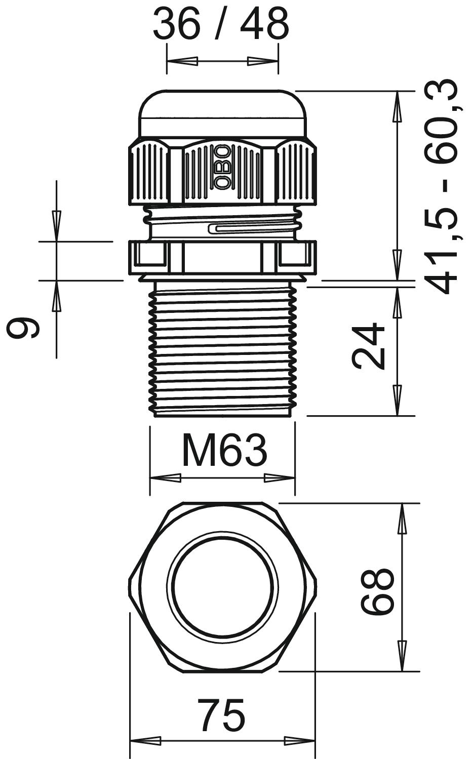 Bend protection no CO2 Footprint (GWP) Cradle-to-Gate 0,4558 kg CO2e / 1 Piece Colour Black Dimension M63 Dimension E 75 mm Dimension L max. 60,3 mm Dimension L min. 41,5 mm Dimension L1 24 mm Dimension L2 9 mm explosion-proof no Fibre-glass reinforced no Flame-resistant acc. to VDE 0471/DIN 695 Part 2-1, test temperature 650°C Flat cable gland no For Ex zone Without For Ex zone dust Without For Ex zone gas Without Halogen-free yes Hexagonal corner dimension 75 mm Impact-resistant no Material Polyamide Nominal thread size 63 Permitted temperature range, max. 65 °C Permitted temperature range, min. -20 °C Protection rating IP68 Sealing area D, max. 48 mm Sealing area D, min. 36 mm Sealing insert, multiple no Splittable gland no Strain relief option yes Thread M63 x 1,5 Thread increase 1,8 mm Thread length 24 mm Thread type Metric Type of seal Sealing ring Unstable torque 12 Nm Version for Straight WAF 68 With locknut no - All types