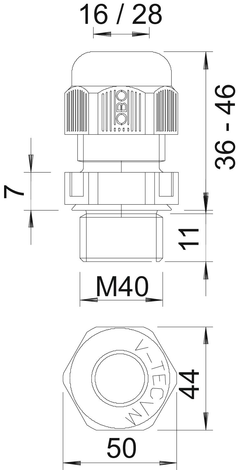 Bend protection no CO2 Footprint (GWP) Cradle-to-Gate 0,1693 kg CO2e / 1 Piece Colour Light grey; RAL 7035 Dimension M40 Dimension E 50 mm Dimension L max. 46 mm Dimension L min. 36 mm Dimension L1 11 mm Dimension L2 7 mm explosion-proof no Fibre-glass reinforced no Flame-resistant acc. to VDE 0471/DIN 695 Part 2-1, test temperature 650°C Flat cable gland no For Ex zone Without For Ex zone dust Without For Ex zone gas Without Halogen-free yes Hexagonal corner dimension 50 mm Impact-resistant no Material Polyamide Nominal thread size 40 Permitted temperature range, max. 65 °C Permitted temperature range, min. -20 °C Protection rating IP68 Sealing area D, max. 28 mm Sealing area D, min. 16 mm Sealing insert, multiple no Splittable gland no Strain relief option yes Thread M40 x 1,5 Thread increase 1,5 mm Thread length 11 mm Thread type Metric Type of seal Sealing ring Unstable torque 10 Nm Version for Straight WAF 44 With locknut no - All types