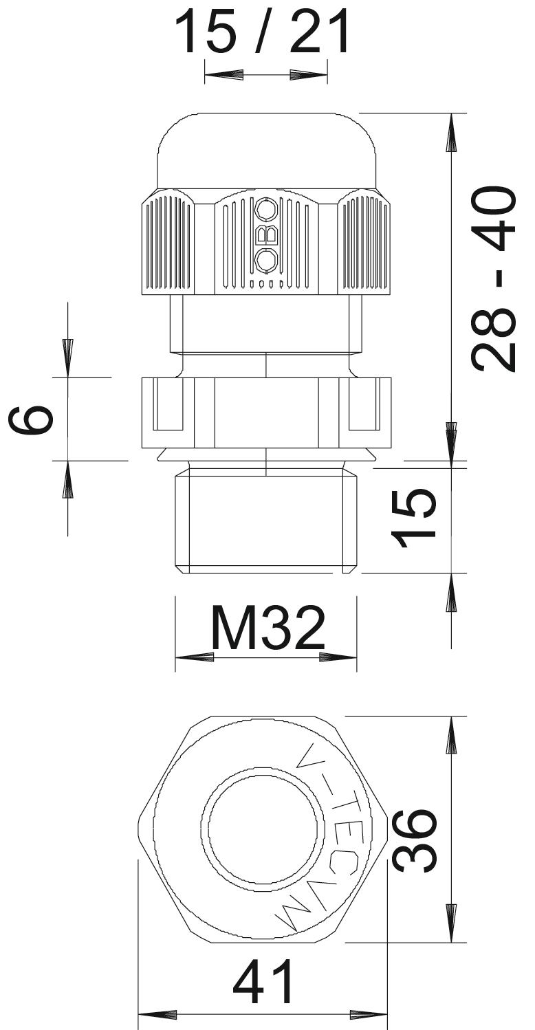 Bend protection no CO2 Footprint (GWP) Cradle-to-Gate 0,1135 kg CO2e / 1 Piece Colour Light grey; RAL 7035 Dimension M32 Dimension E 41 mm Dimension L max. 40 mm Dimension L min. 28 mm Dimension L1 15 mm Dimension L2 6 mm explosion-proof no Fibre-glass reinforced no Flame-resistant acc. to VDE 0471/DIN 695 Part 2-1, test temperature 650°C Flat cable gland no For Ex zone Without For Ex zone dust Without For Ex zone gas Without Halogen-free yes Hexagonal corner dimension 41 mm Impact-resistant no Material Polyamide Nominal thread size 32 Permitted temperature range, max. 65 °C Permitted temperature range, min. -20 °C Protection rating IP68 Sealing area D, max. 21 mm Sealing area D, min. 15 mm Sealing insert, multiple no Splittable gland no Strain relief option yes Thread M32 x 1,5 Thread increase 1,5 mm Thread length 15 mm Thread type Metric Type of seal Sealing ring Unstable torque 7,5 Nm Version for Straight WAF 36 With locknut no - All types