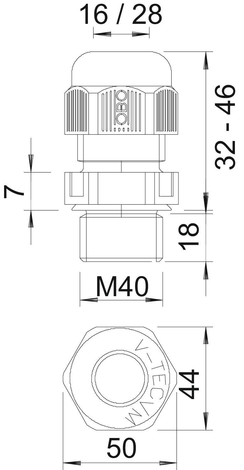 Bend protection no CO2 Footprint (GWP) Cradle-to-Gate 0,1861 kg CO2e / 1 Piece Colour Light grey; RAL 7035 Dimension M40 Dimension E 50 mm Dimension L max. 46 mm Dimension L min. 32 mm Dimension L1 18 mm Dimension L2 7 mm explosion-proof no Fibre-glass reinforced no Flame-resistant acc. to VDE 0471/DIN 695 Part 2-1, test temperature 650°C Flat cable gland no For Ex zone Without For Ex zone dust Without For Ex zone gas Without Halogen-free yes Hexagonal corner dimension 50 mm Impact-resistant no Material Polyamide Nominal thread size 40 Permitted temperature range, max. 65 °C Permitted temperature range, min. -20 °C Protection rating IP68 Sealing area D, max. 28 mm Sealing area D, min. 16 mm Sealing insert, multiple no Splittable gland no Strain relief option yes Thread M40 x 1,5 Thread increase 1,5 mm Thread length 18 mm Thread type Metric Type of seal Sealing ring Unstable torque 10 Nm Version for Straight WAF 44 With locknut no - All types