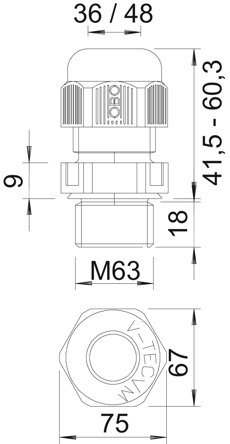 Bend protection no CO2 Footprint (GWP) Cradle-to-Gate 0,448 kg CO2e / 1 Piece Colour Light grey; RAL 7035 Dimension M63 Dimension E 75 mm Dimension L max. 60,3 mm Dimension L min. 41,5 mm Dimension L1 18 mm Dimension L2 9 mm explosion-proof no Fibre-glass reinforced no Flame-resistant acc. to VDE 0471/DIN 695 Part 2-1, test temperature 650°C Flat cable gland no For Ex zone Without For Ex zone dust Without For Ex zone gas Without Halogen-free yes Hexagonal corner dimension 75 mm Impact-resistant no Material Polyamide Nominal thread size 63 Permitted temperature range, max. 65 °C Permitted temperature range, min. -20 °C Protection rating IP68 Sealing area D, max. 48 mm Sealing area D, min. 36 mm Sealing insert, multiple no Splittable gland no Strain relief option yes Thread M63 x 1,5 Thread increase 1,5 mm Thread length 18 mm Thread type Metric Type of seal Sealing ring Unstable torque 12 Nm Version for Straight WAF 68 With locknut no - All types