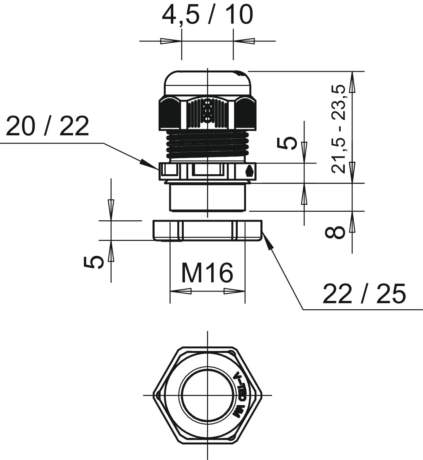 Bend protection no CO2 Footprint (GWP) Cradle-to-Gate 0,0375 kg CO2e / 1 Piece Colour Light grey; RAL 7035 Dimension M16 Dimension E1 (mm) 22 mm Dimension E2 25 mm Dimension L max. 23,5 mm Dimension L min. 21,5 mm Dimension L1 8 mm Dimension L2 5 mm Dimension L3 5 mm explosion-proof no Fibre-glass reinforced no Flame-resistant acc. to VDE 0471/DIN 695 Part 2-1, test temperature 650°C Flat cable gland no For Ex zone Without For Ex zone dust Without For Ex zone gas Without Halogen-free yes Impact-resistant no Material Polyamide Nominal thread size 16 Permitted temperature range, max. 65 °C Permitted temperature range, min. -20 °C Protection rating IP68 Sealing area D, max. 10 mm Sealing area D, min. 4,5 mm Sealing insert, multiple no Splittable gland no Strain relief option yes Thread M16 x 1,5 Thread increase 1,5 mm Thread length 8 mm Thread type Metric Type of seal Sealing ring Unstable torque 2 Nm Version for Straight WAF 1 20 mm WAF 2 22 mm With locknut no - All types