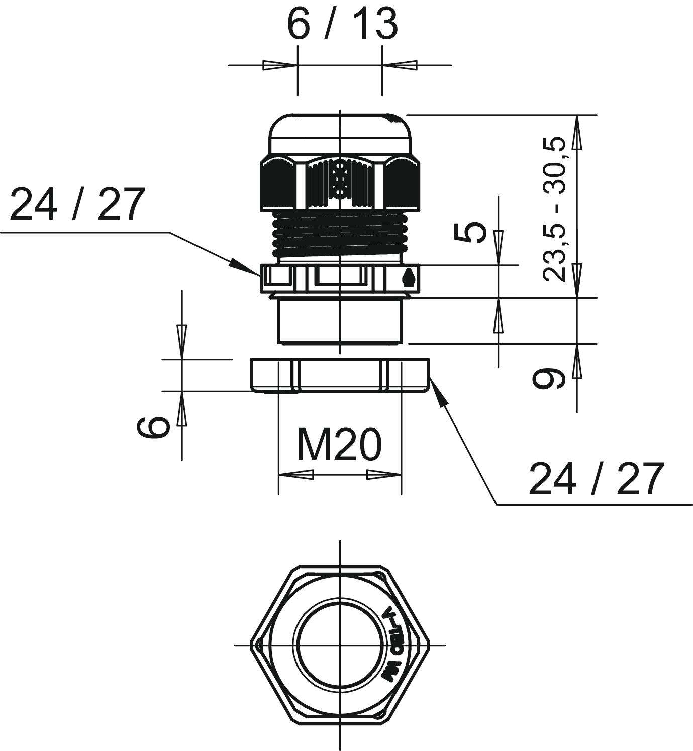 Bend protection no CO2 Footprint (GWP) Cradle-to-Gate 0,0503 kg CO2e / 1 Piece Colour Light grey; RAL 7035 Dimension M20 Dimension E1 (mm) 27 mm Dimension E2 27 mm Dimension L max. 30,5 mm Dimension L min. 23,5 mm Dimension L1 9 mm Dimension L2 5 mm Dimension L3 6 mm explosion-proof no Fibre-glass reinforced no Flame-resistant acc. to VDE 0471/DIN 695 Part 2-1, test temperature 650°C Flat cable gland no For Ex zone Without For Ex zone dust Without For Ex zone gas Without Halogen-free yes Impact-resistant no Material Polyamide Nominal thread size 20 Permitted temperature range, max. 65 °C Permitted temperature range, min. -20 °C Protection rating IP68 Sealing area D, max. 13 mm Sealing area D, min. 6 mm Sealing insert, multiple no Splittable gland no Strain relief option yes Thread M20 x 1,5 Thread increase 1,5 mm Thread length 9 mm Thread type Metric Type of seal Sealing ring Unstable torque 3,8 Nm Version for Straight WAF 1 24 mm WAF 2 24 mm With locknut no - All types